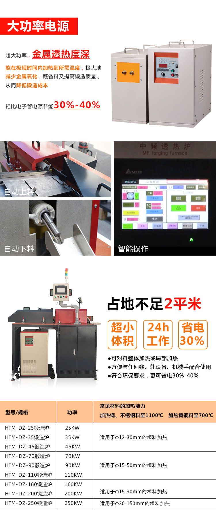 别名Q中频锻造加热炉 型号QHTM-DZ ?sh)压Q?80V 功率Q?5-250kw 用途:新型节能中频感应加热透热锻造炉铜棒淬火退火透热U冲L讑֤,适用于铜、铁、铝材的透热Q圆料、方形料或其它Ş状毛坏料{的q箋透热Q可Ҏ(gu)整体加热或局部加?/br>